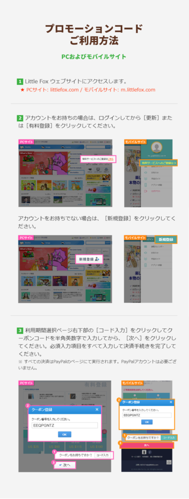 講座に申し込みますと、数日中にLittle Foxのクーポンコードが発行されます。